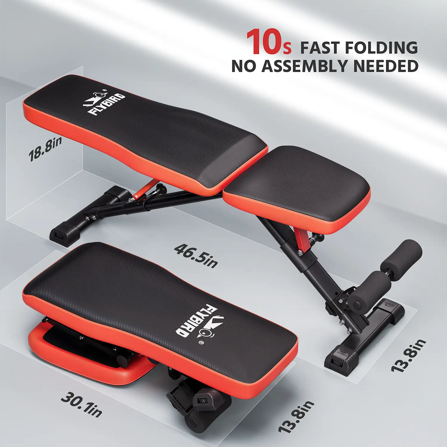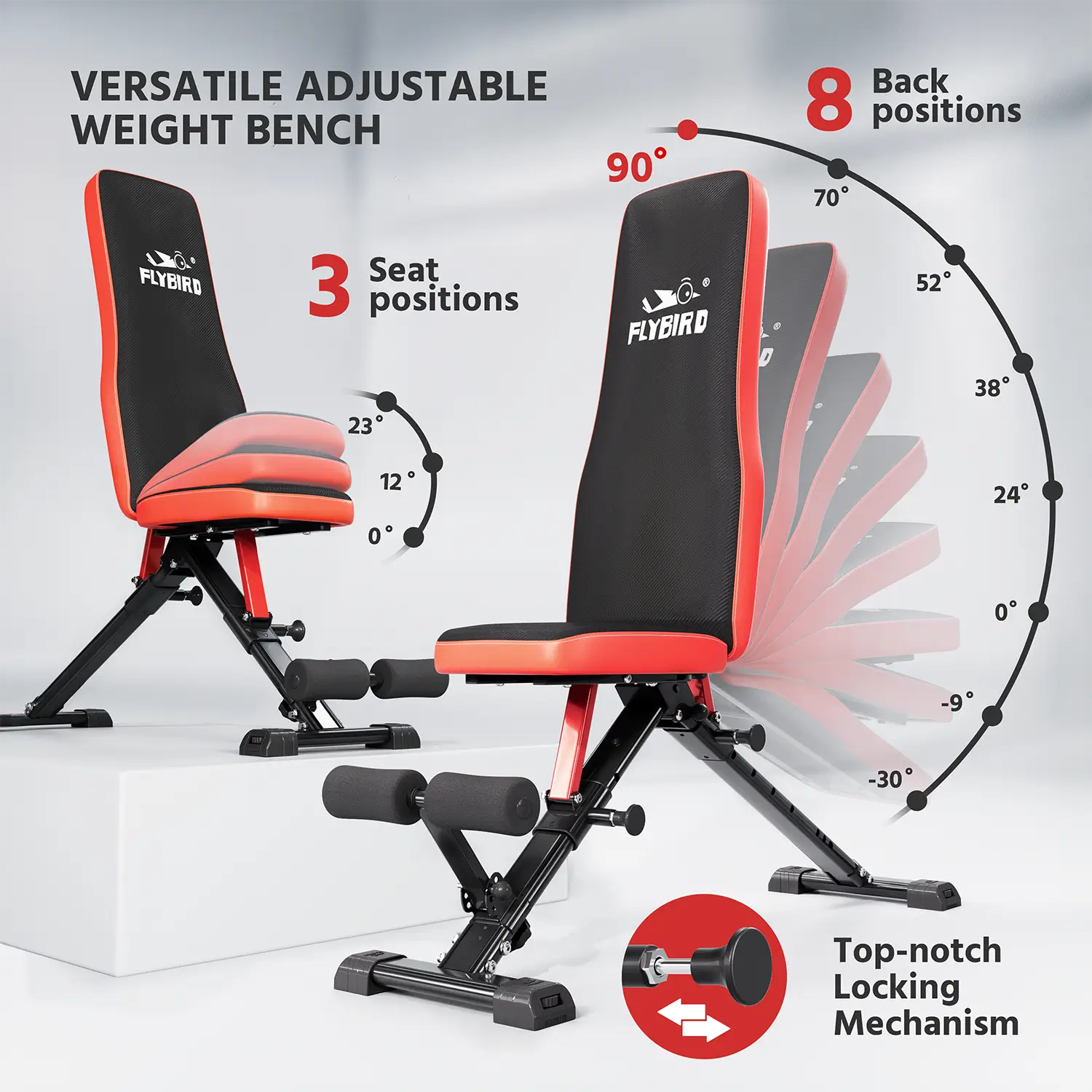 The FLYBIRD Foldable Adjustable Weight Bench FB299 is known for its stability, reliability, high quality, no need for assembly, multi-angle adjustment, and foldability, making it one of our most popular adjustable weight benches. This bench is made from premium steel and high-quality PU leather, with a flat tube design that increases ground contact area to ensure stability and durability. The flat tube is equipped with protective plastic covers to safeguard your floors when moving or placing the bench.To enhance your workout experience, we use 2-inch high-density foam and have widened the backrest.