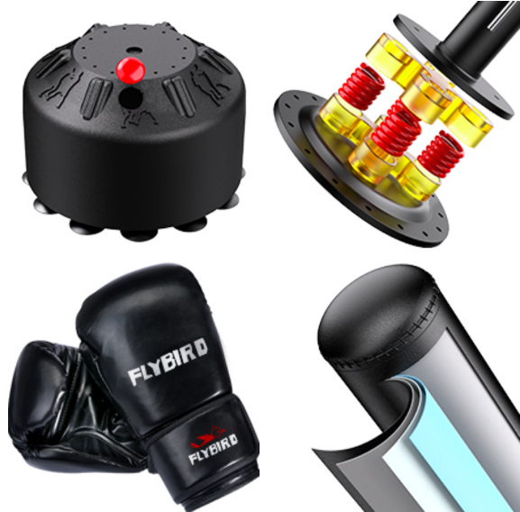 Flybird freestanding punching bag boasts a multi-layer construction, with 2mm premium PU leather, highly resilient EPE foam, fabric buffers, and an encased stainless steel tube.