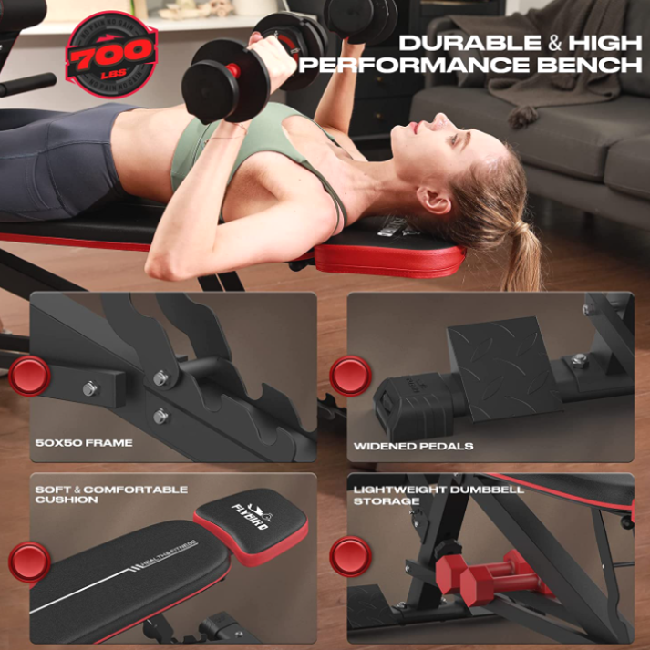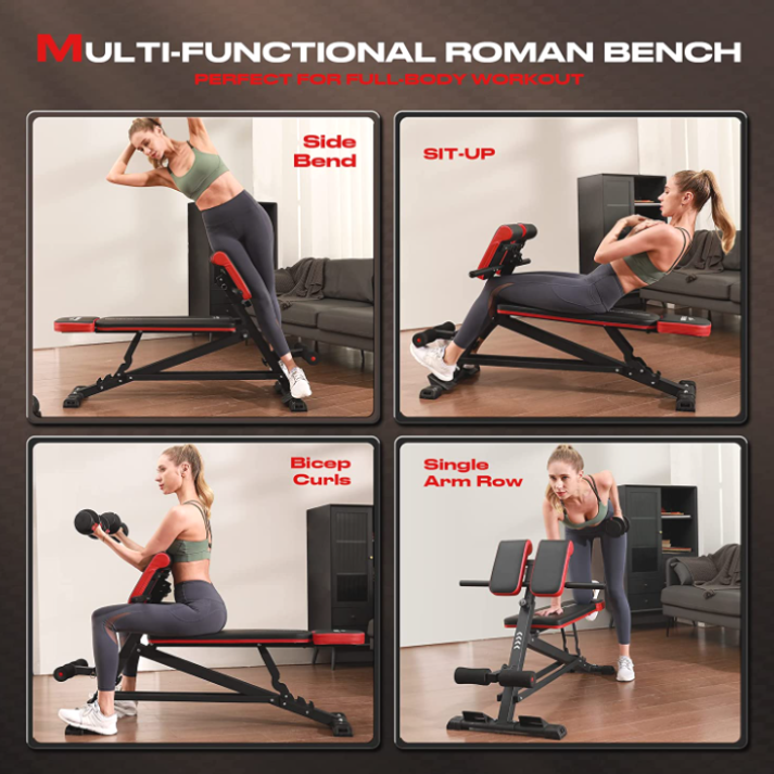 Use FLYBIRD adjustable roman bench to do bicep curls, bench press, dumbbell excercise, upward inclie push-ups to enhance your arm and chest strength. Back extensions, side bends, sit-ups and curls can help you train the abdominal core and glute/legs