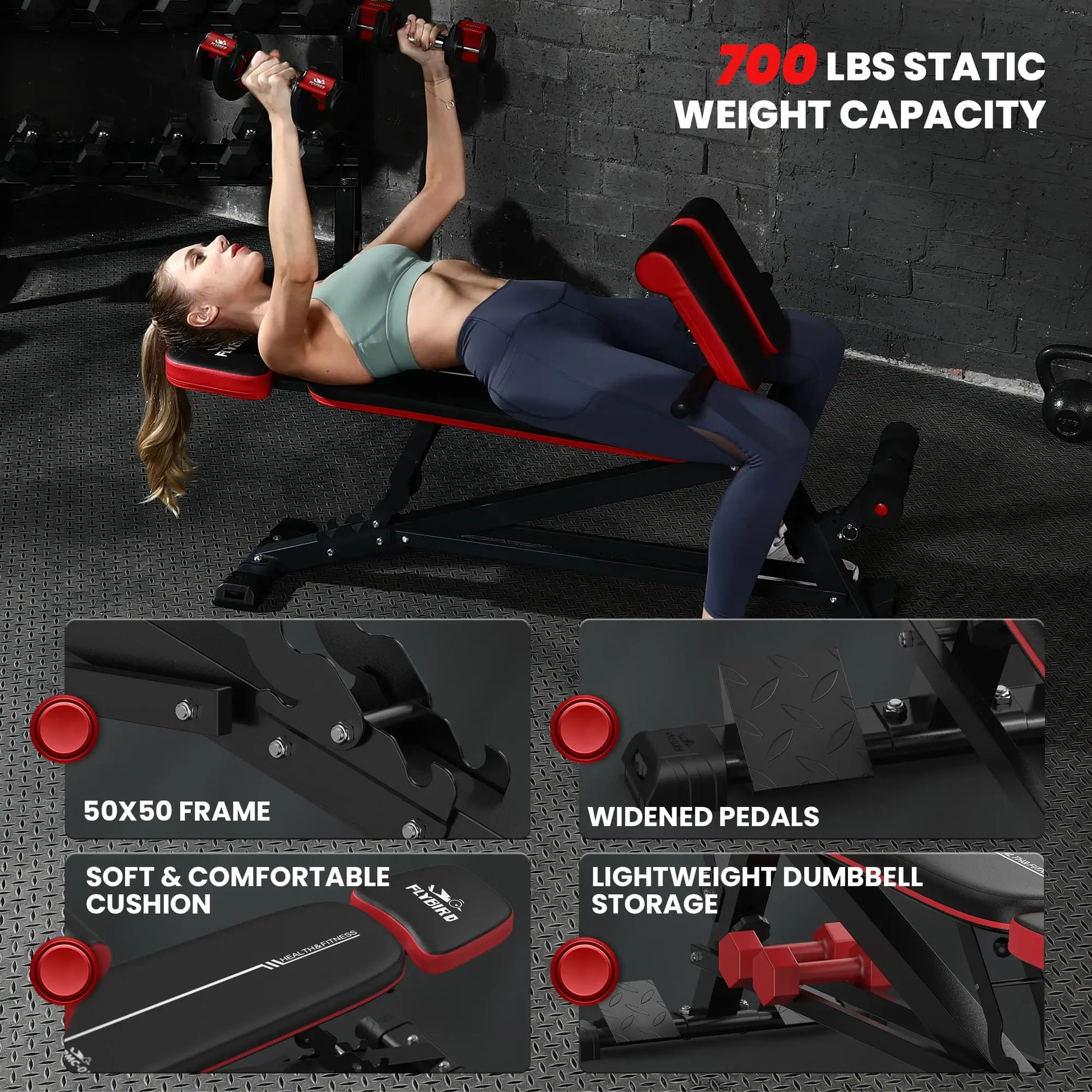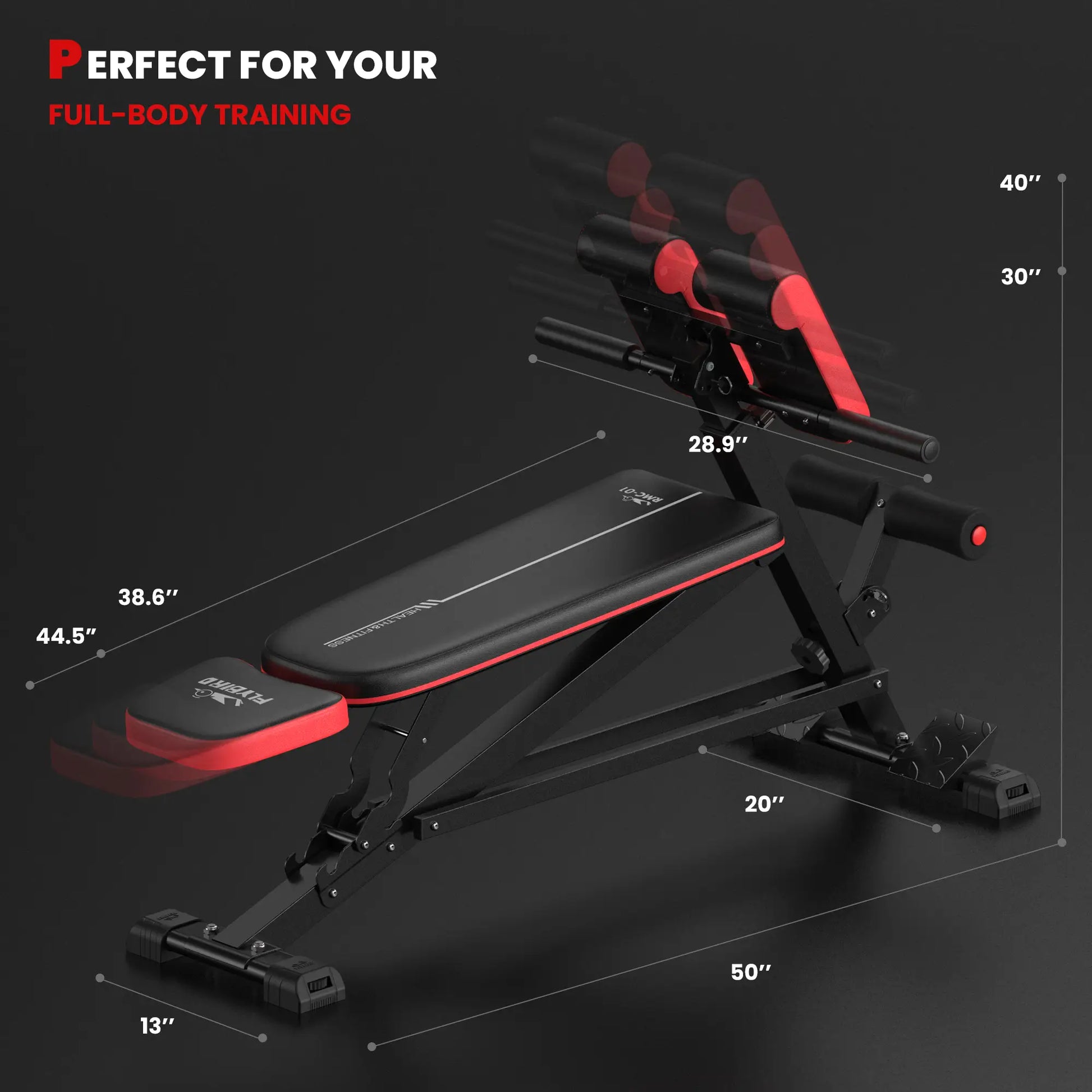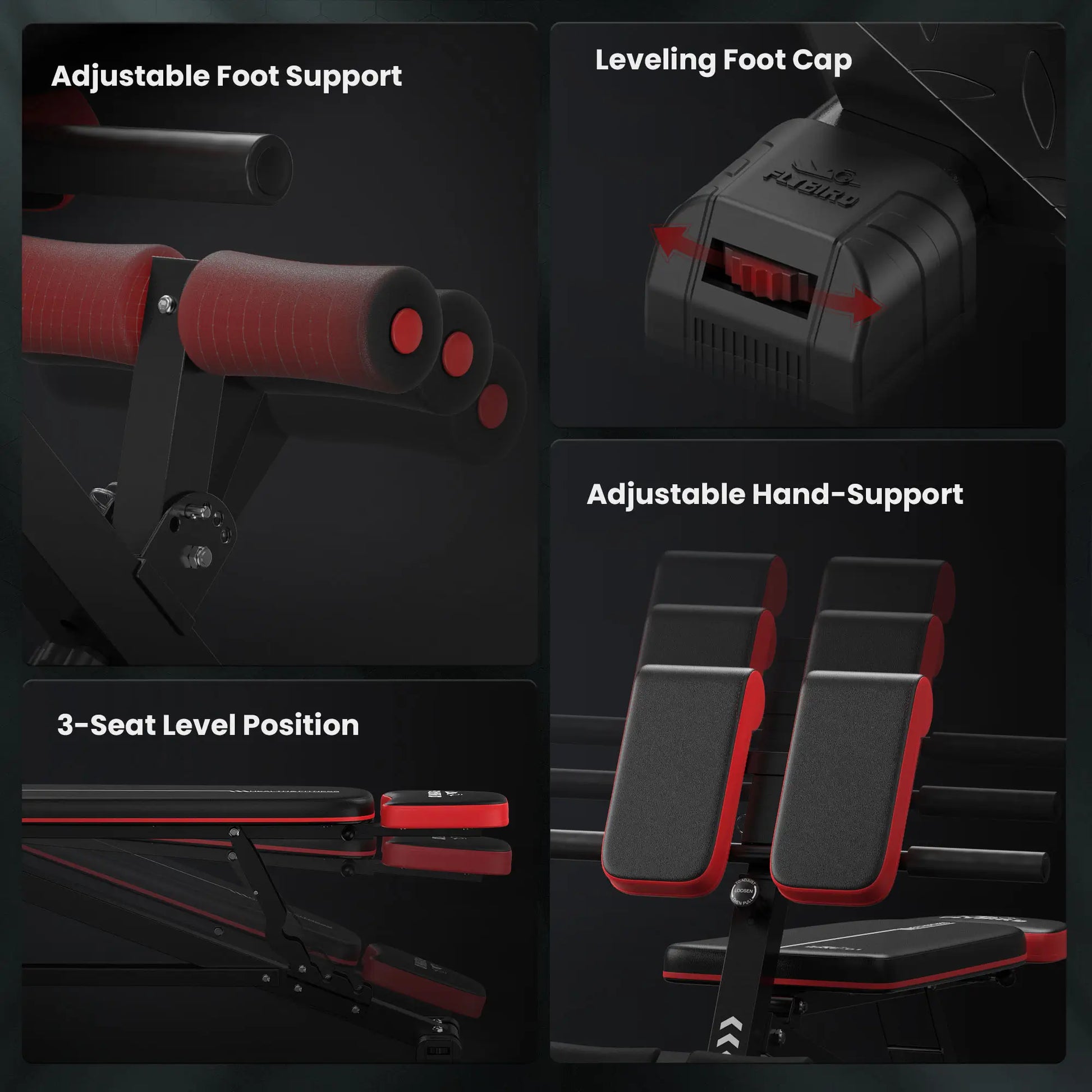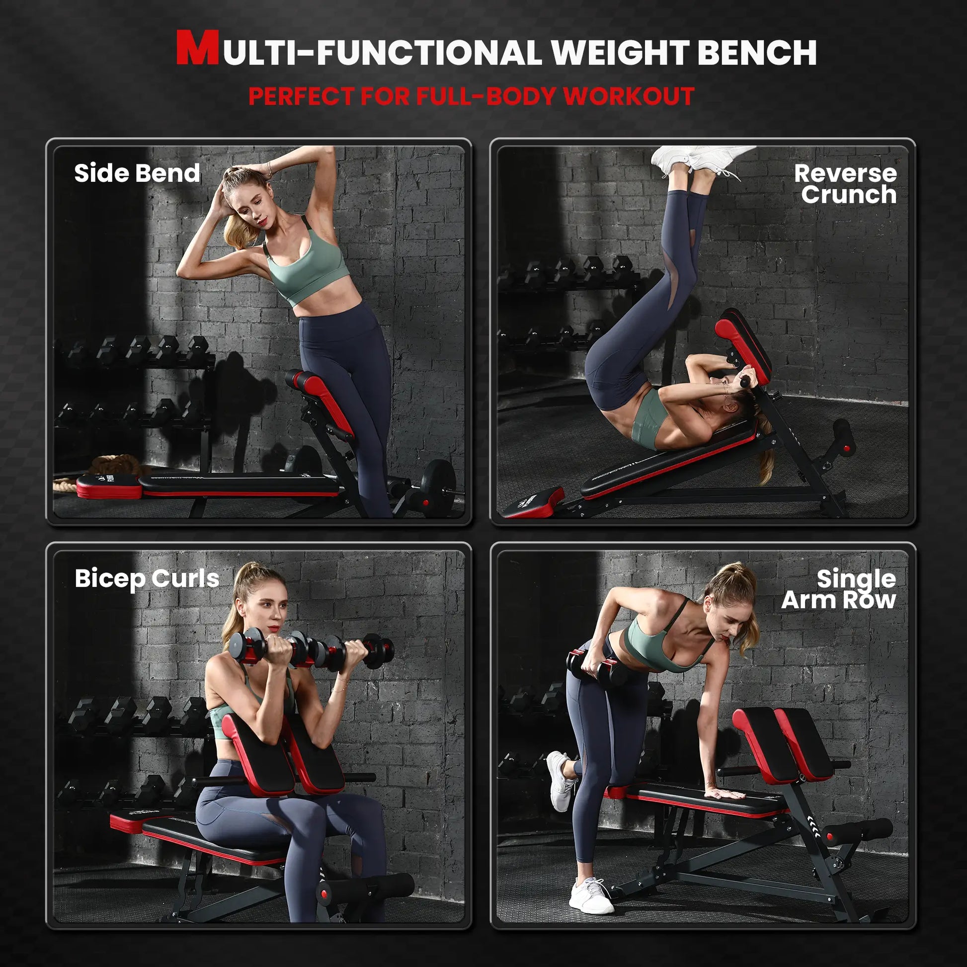 Use FLYBIRD adjustable roman bench to do bicep curls, bench press, dumbbell excercise, upward inclie push-ups to enhance your arm and chest strength. Back extensions, side bends, sit-ups and curls can help you train the abdominal core and glute/legs
